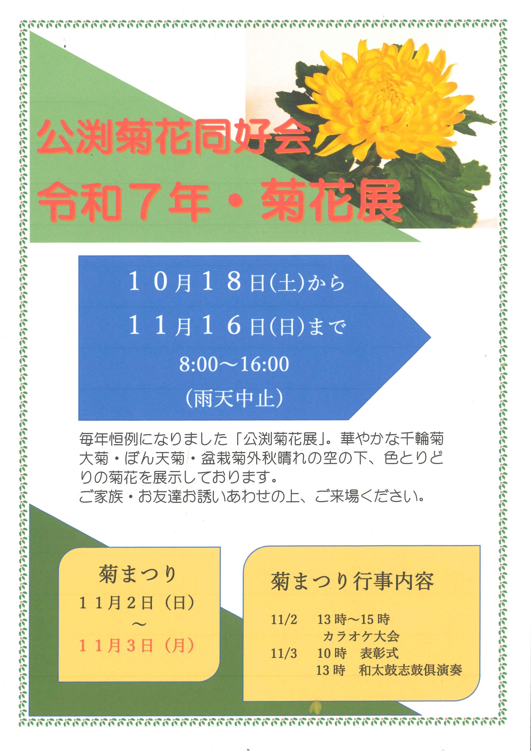 毎年恒例の公渕菊花同好会様による「菊花展」が下記のとおり開催されます。華やかな千輪菊、大菊、ぼん天菊、盆栽菊など、色とりどりの菊花が展示されます。また、11月2日(日)~11月3日(月)は「菊まつり」が開催されます。