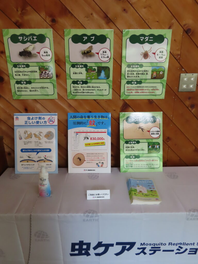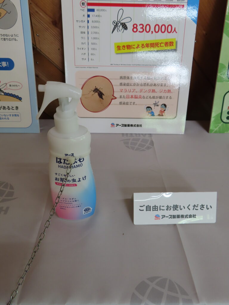 来園者の皆様には、試供品の虫よけ剤を自由に使ってもらって、害虫から自分の身をお守りください。